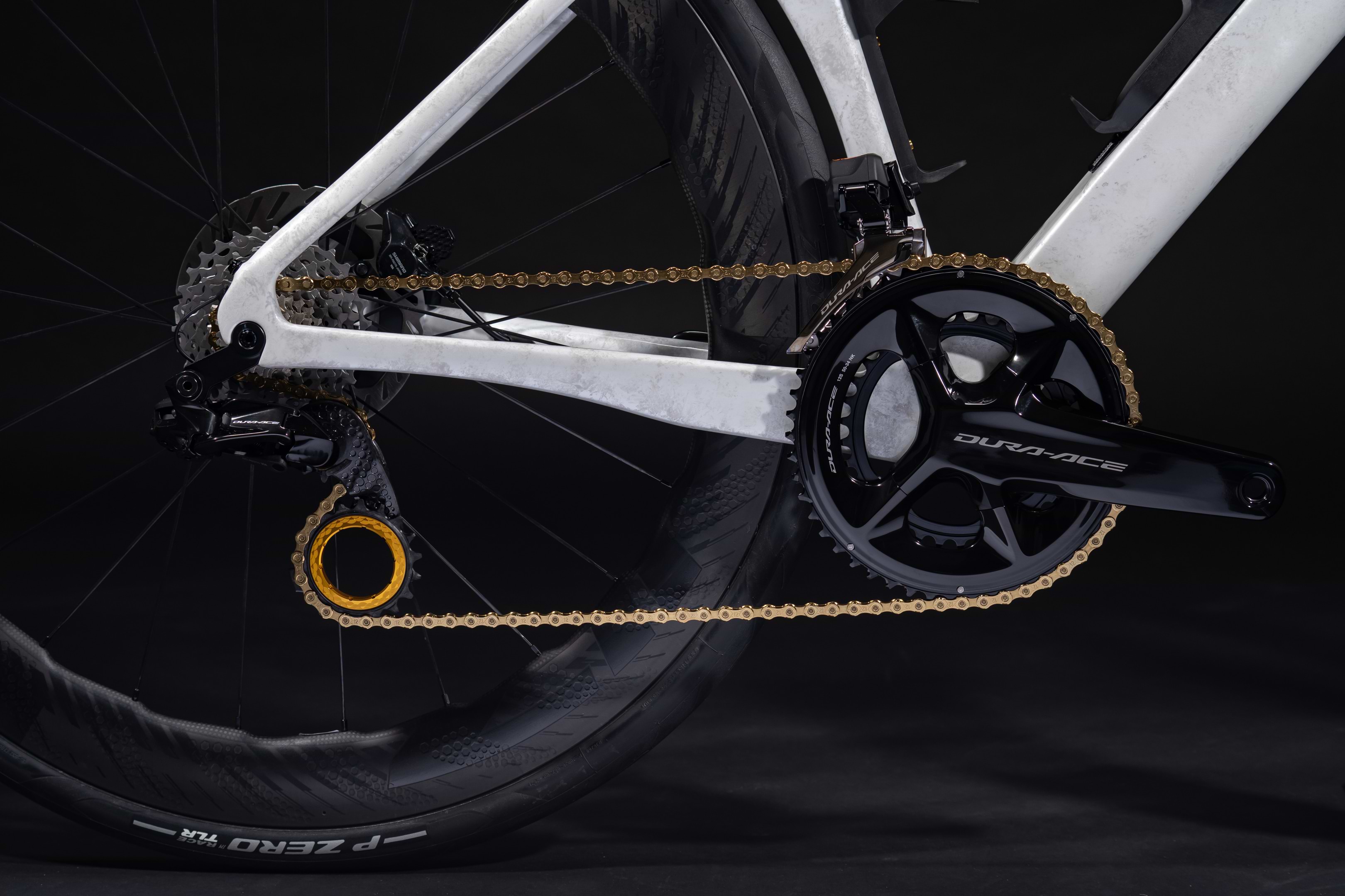 The Allroad SL R marks a new era in high-performance versatility, redefining what you can expect from a premium carbon road bike. Finished in a striking pearl white paint with gold leaf details, a gold chain, and oversized pulley wheel, it’s built to stand out. Intricate gold leaf detailing on the top tube completes this bold, refined aesthetic.